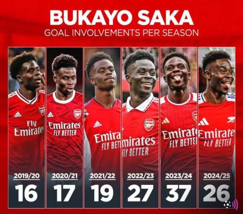 两周前,他在英超第200战对西汉姆点球破门,直接参与进球数破百,正式跻身酋长时代最强行列。2023年,记者查尔斯·瓦茨称他为“世界最佳右边锋”。即便如今萨拉赫略占上风,萨卡仍处于金字塔尖。放眼队内,威廉·萨利巴、加布里埃尔、德克兰·赖斯可争高低,但若论传奇度,萨卡已逼近枪手巅峰。