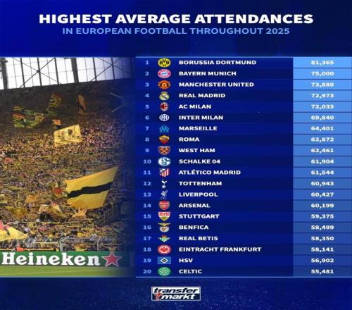 德转列2025欧洲俱乐部场均上座榜:多特居首,拜仁曼联分列二三