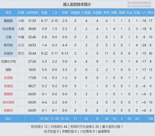 哈登14投6中,拿到21+3+5。威少10中4,得到12+3+4。刚刚结束的另一场比赛,湖人主场106-128不敌活塞。最近5场比赛,湖人只有1胜4负。快船狂赢41分,湖人惨败22分,洛杉矶冰火两重天。湖人末节崩盘,单节18-32输了14分!