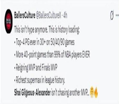 美媒BC写道:目前是第四位场均30+且50/40/90的球员;拥有比现役超过99%球员更多的40+;上赛季MVP+FMVP;历史第一顶薪球员,他正在追逐连庄MVP。