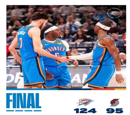 北京时间1月1日,NBA常规赛,雷霆124-95大胜开拓者拿到三连胜。这场比赛是一场一边倒的比赛,两队都很年轻都很擅长推快攻,可运动员的综合实力差距较大,开拓者核心阿夫迪亚被防的14中4、夏普17中5,卡马拉7中2,所以比赛早早进入垃圾时间。