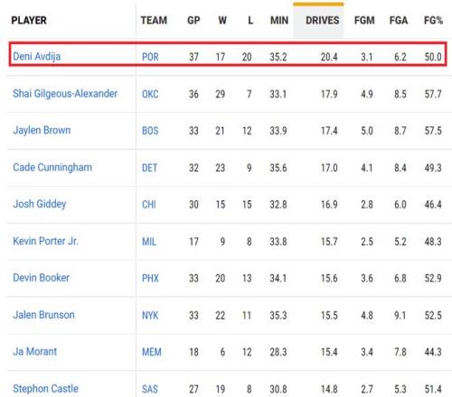 值得一提的是,阿夫迪亚是本赛季的突破之王,场均20.4次突破排名联盟第一,亚历山大17.9次排名第二,杰伦·布朗17.4次第三。阿夫迪亚场均靠突破得到10.1分,还场均靠突破送出2.8次助攻。